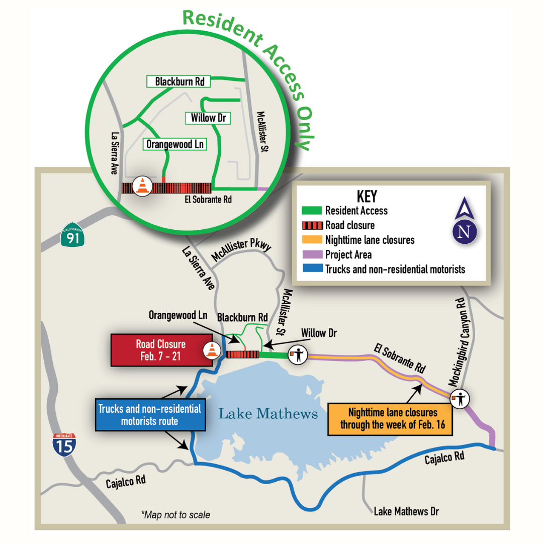 Trucks and non-residential motorists should use the posted detour via La Sierra Ave. to Cajalco Rd.